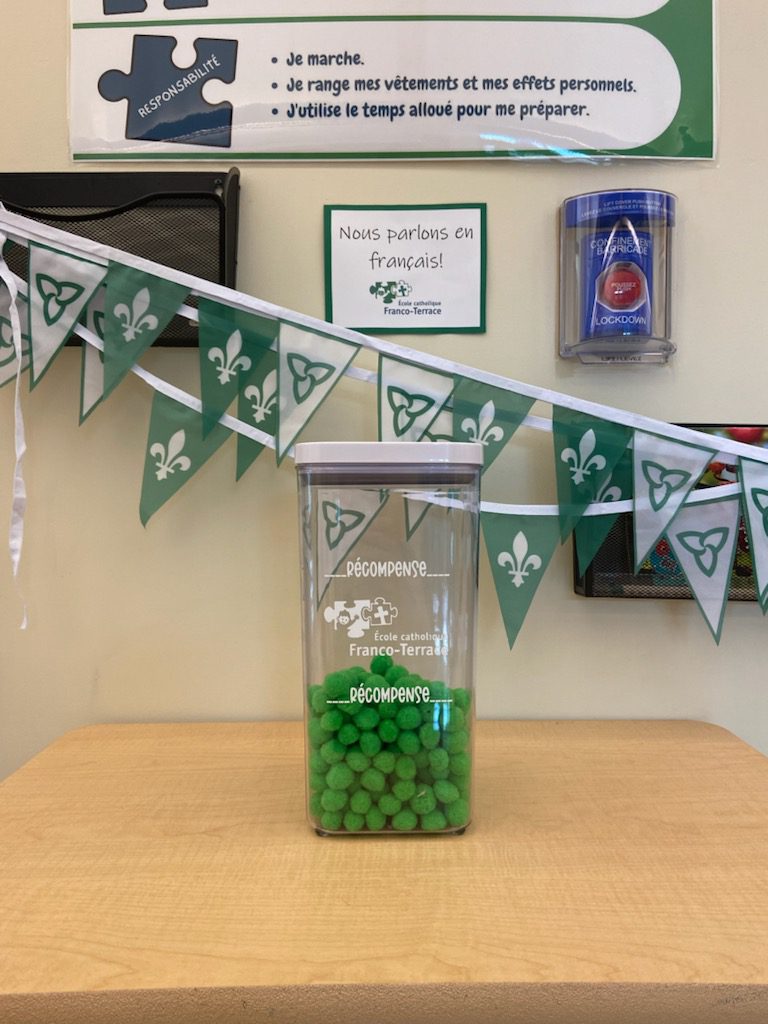 « Nous avons une tour et quand les élèves parlent en français on leur donne des pompons pour la remplir », explique Mme Scott. « Quand ils la remplissent, l’école entière se mérite une récompense. » Si les élèves la remplissent deux fois, ils se méritent une sortie éducative, comme la possibilité d’aller à Gammondale Farm au sud de Thunder Bay à l’automne.