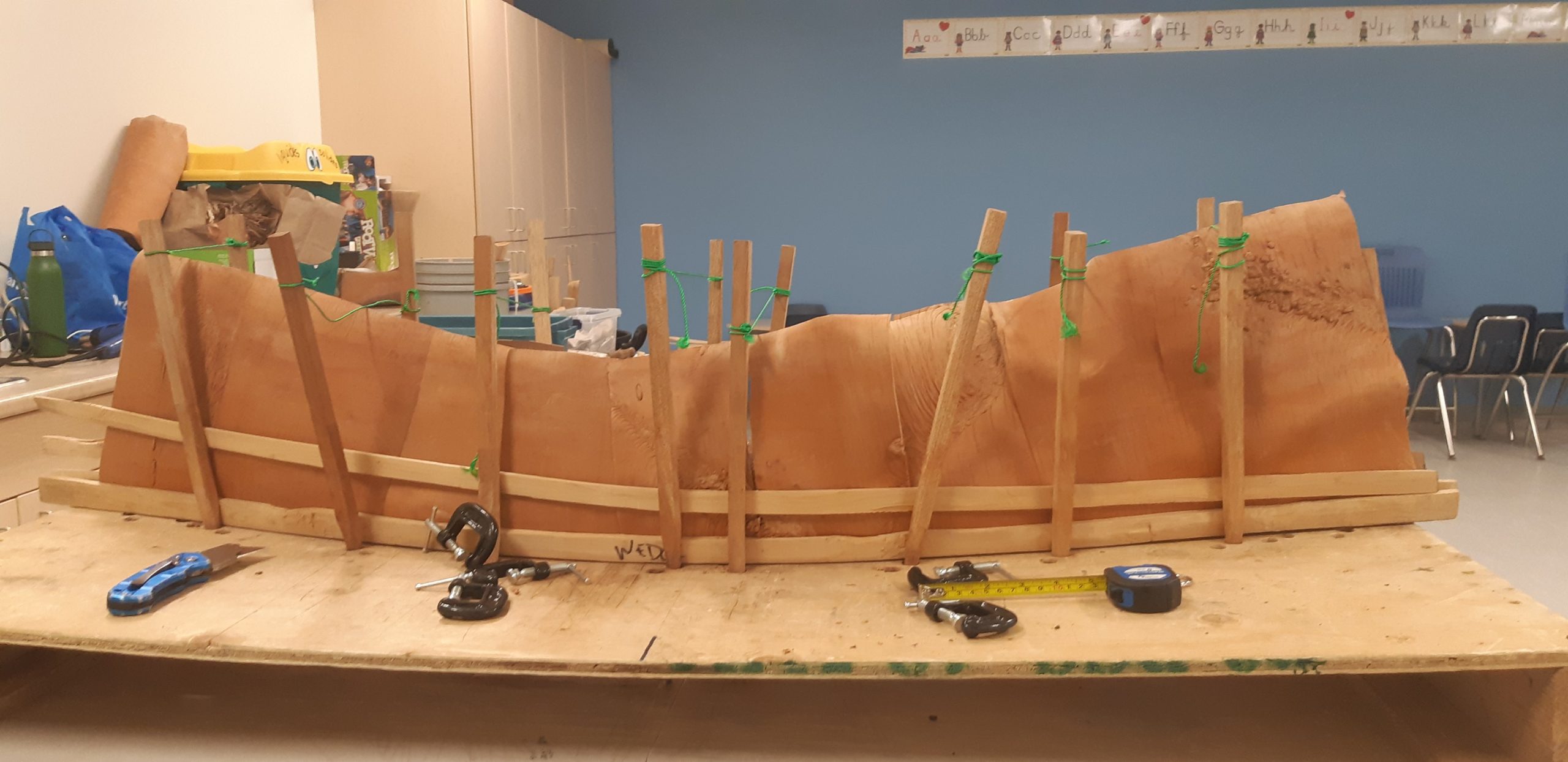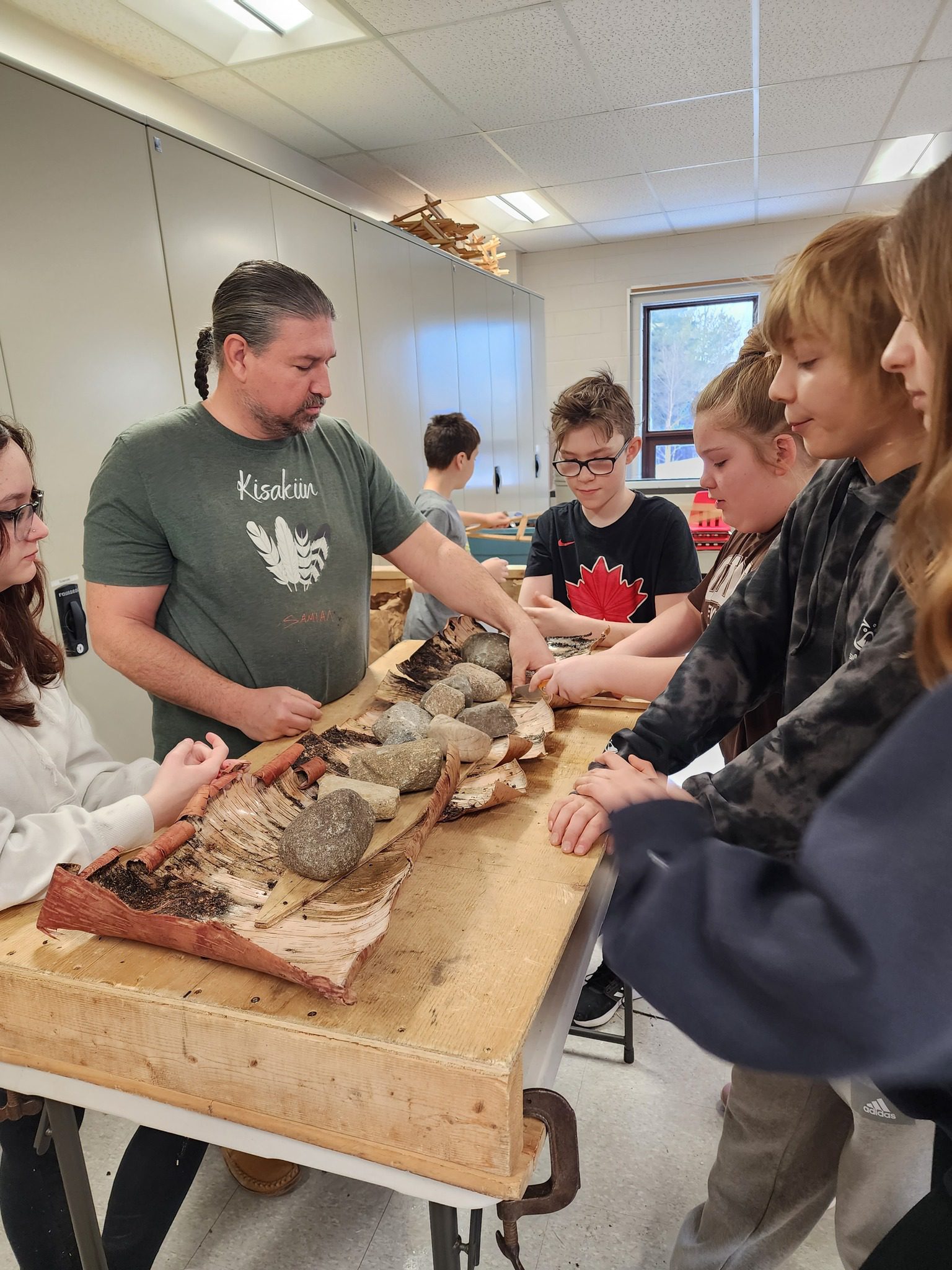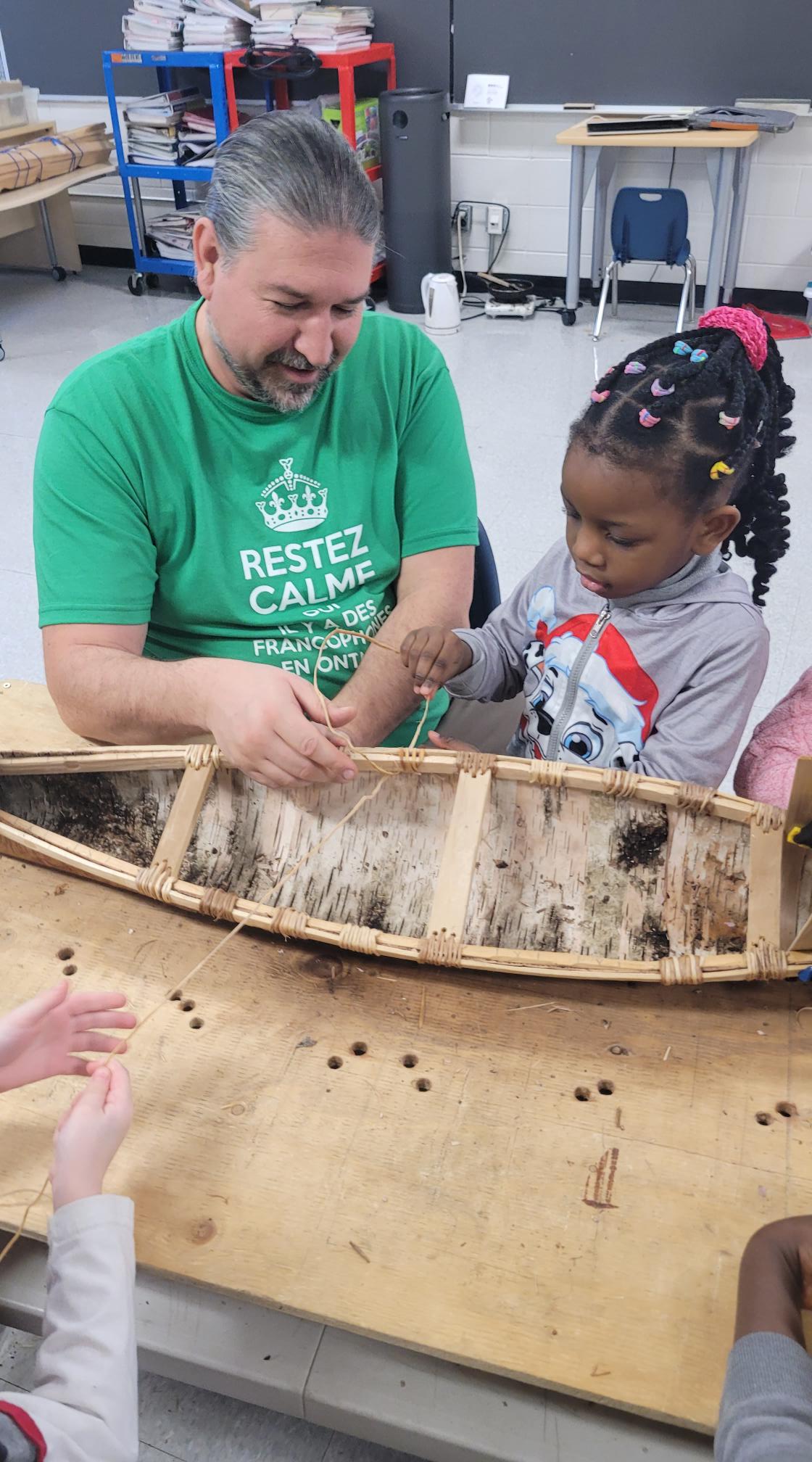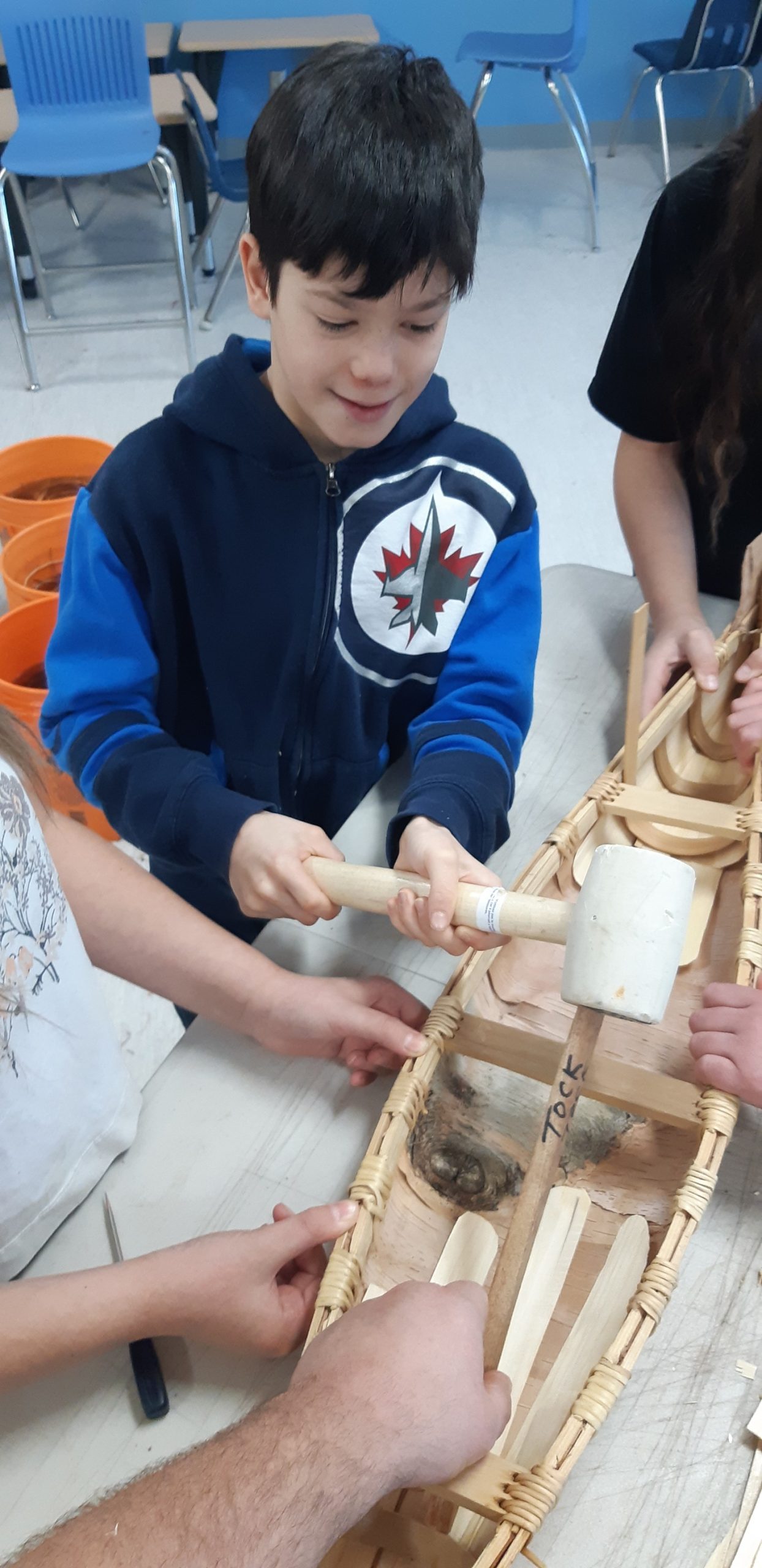 Cette expérience enrichissante a permis à nos élèves d’apprendre davantage sur la culture Franco-Métis, ainsi que les étapes culturelles et éducatives de la fabrication traditionnelle d’un petit canot d’écorce authentique. Les élèves ont choisi l’écorce, manipulé les outils, épluché et pris des racines pour attacher l’écorce au squelette du canot, et déposé les roches afin de stabiliser l’écorce. Lors du processus, Christian a partagé les enseignements liés à la confection d’un canot tels que les sept cadeaux et la roue de médecine.