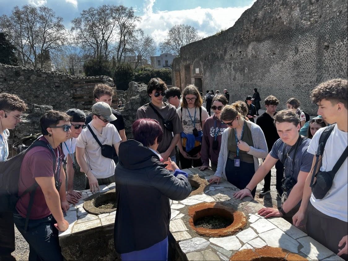 Le lendemain, le groupe a pris la route vers Pompéi pour une visite marquante de cette ville romaine figée dans le temps depuis l’éruption du Vésuve en l’an 79. Exceptionnellement bien conservée, Pompéi offre un aperçu saisissant de la vie quotidienne des Romains il y a près de 2 000 ans : maisons, rues, fresques et moulages des habitants surpris par la catastrophe. Une expérience à la fois éducative et émouvante, qui a profondément marqué les élèves. Le groupe est ensuite retourné à Rome pour une dernière soirée en Italie avant de poursuivre l’aventure.