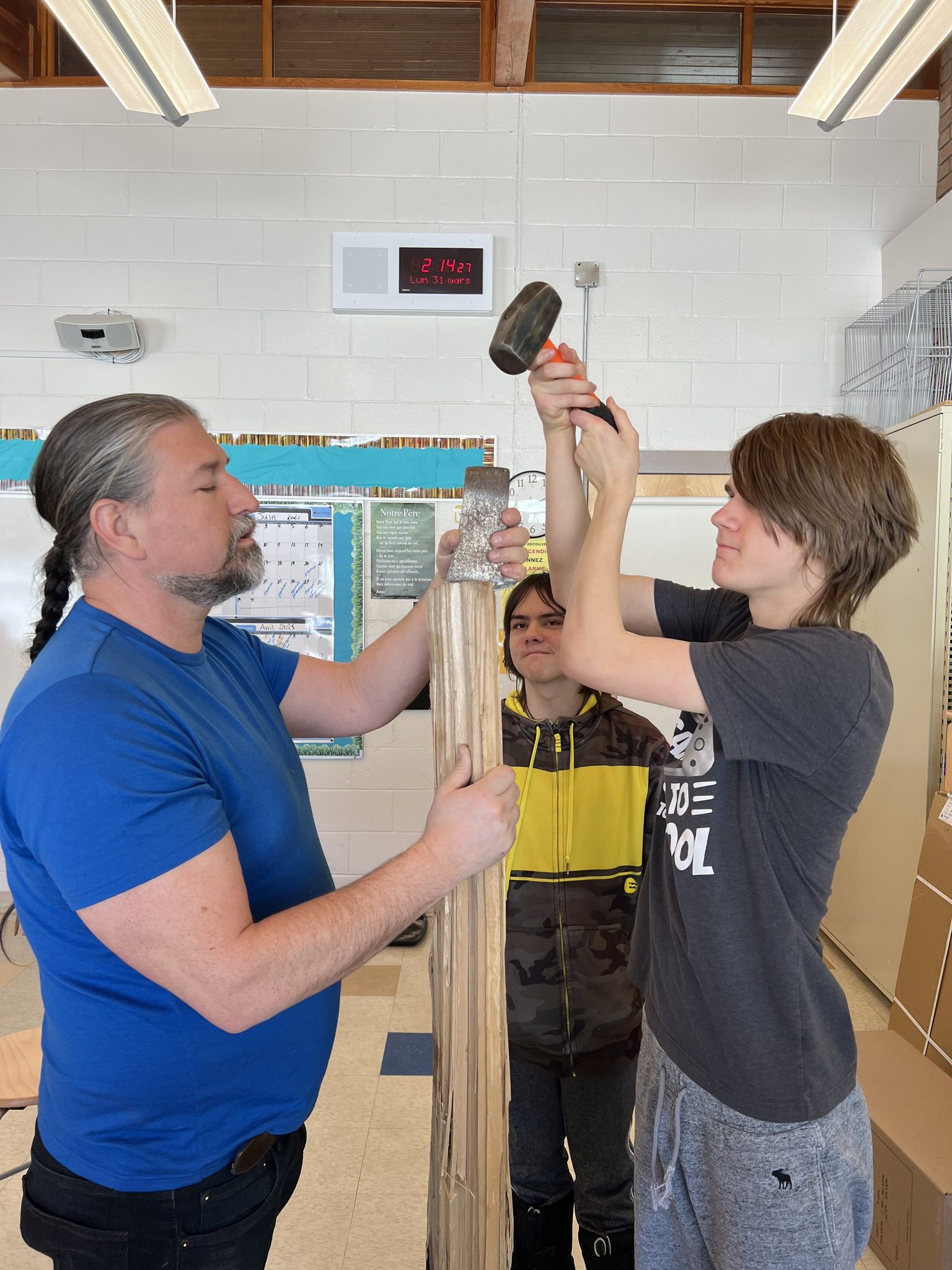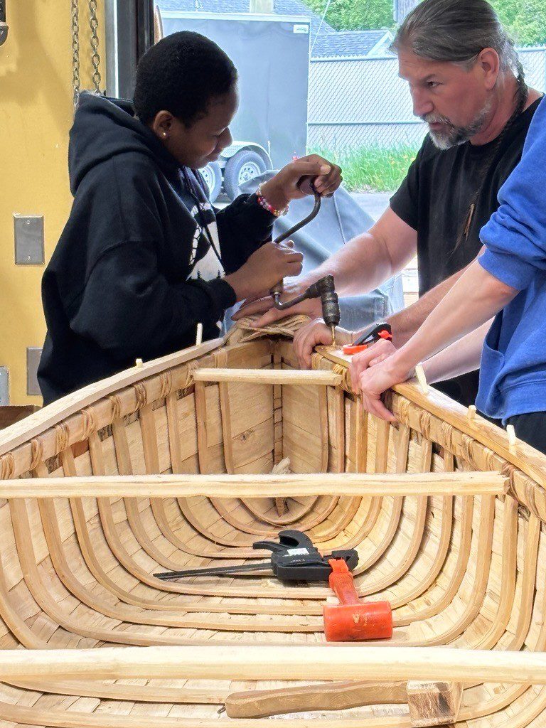 Guided by Christian Pilon le voyageur, the students learned ancestral canoe-building techniques. In Dryden, they prepared cedar pieces that were sent to Thunder Bay for final assembly.