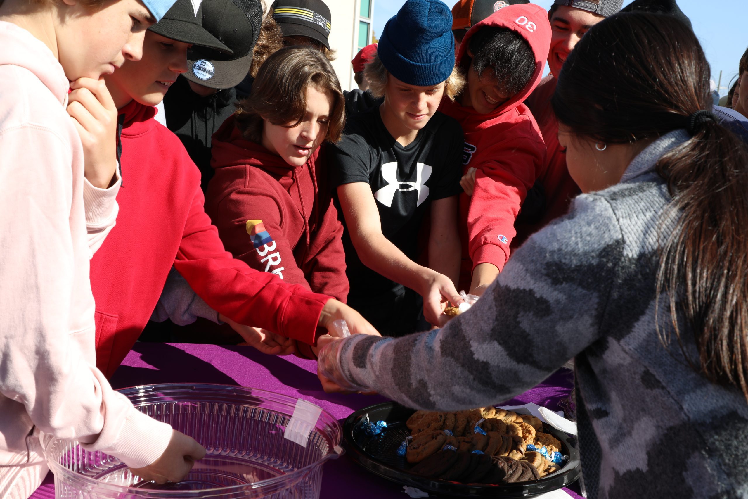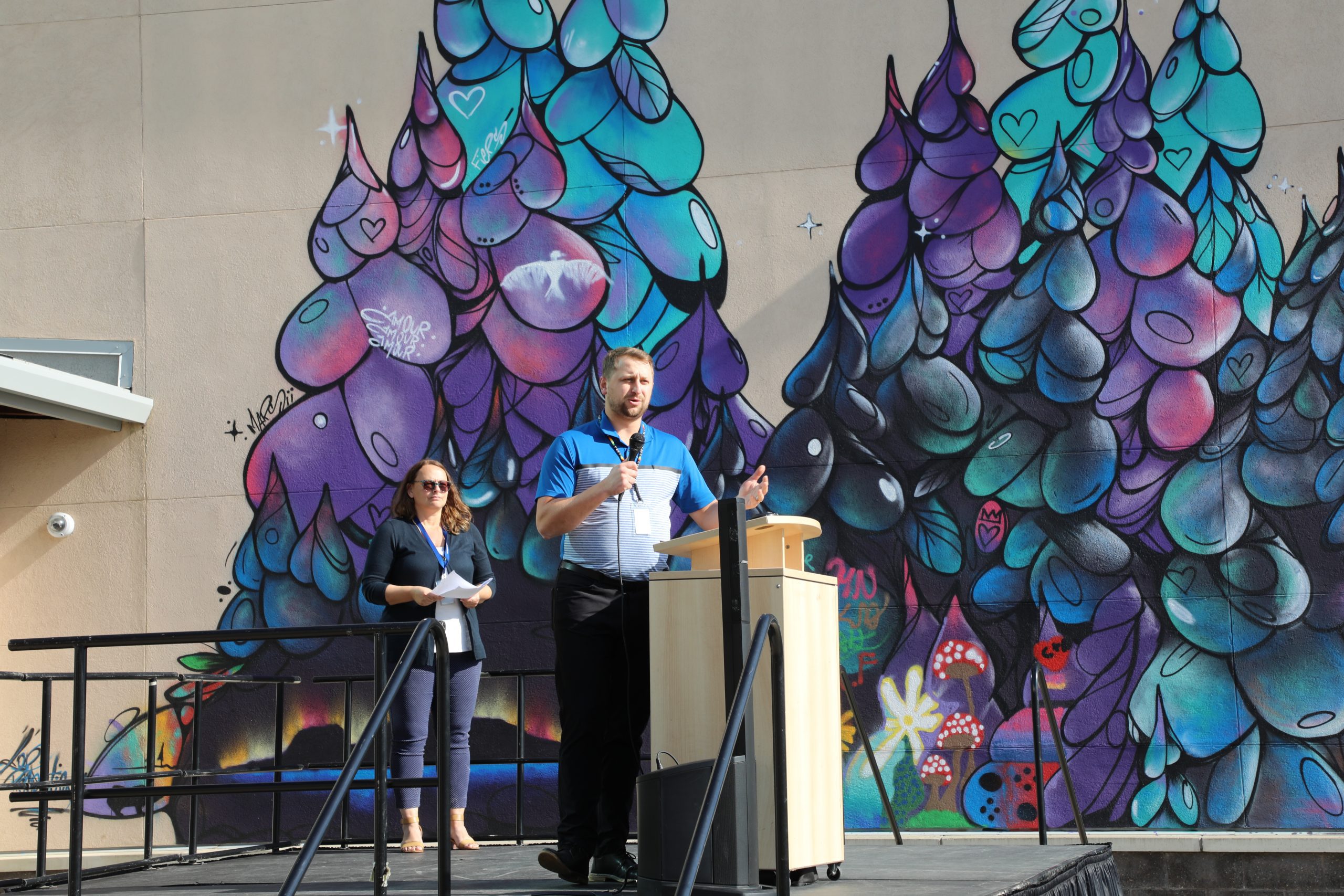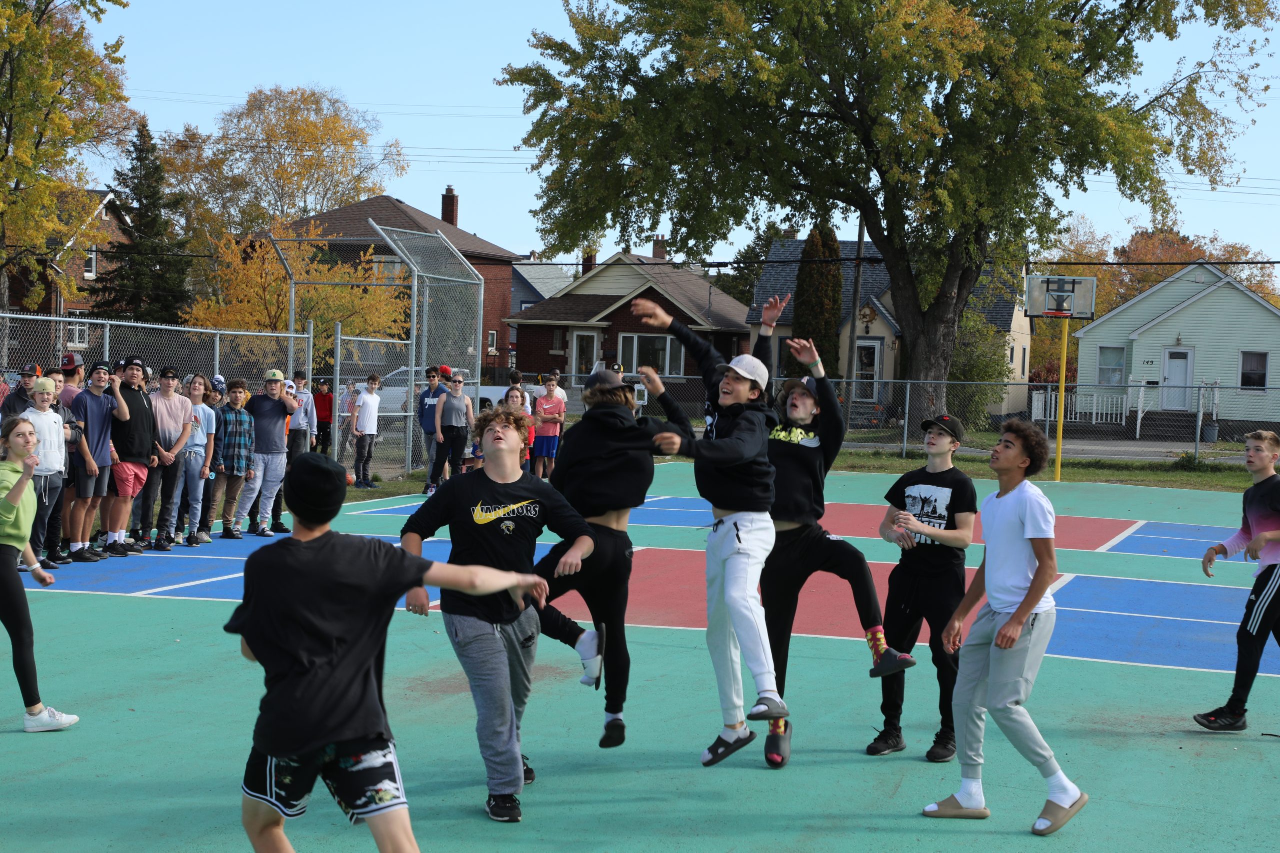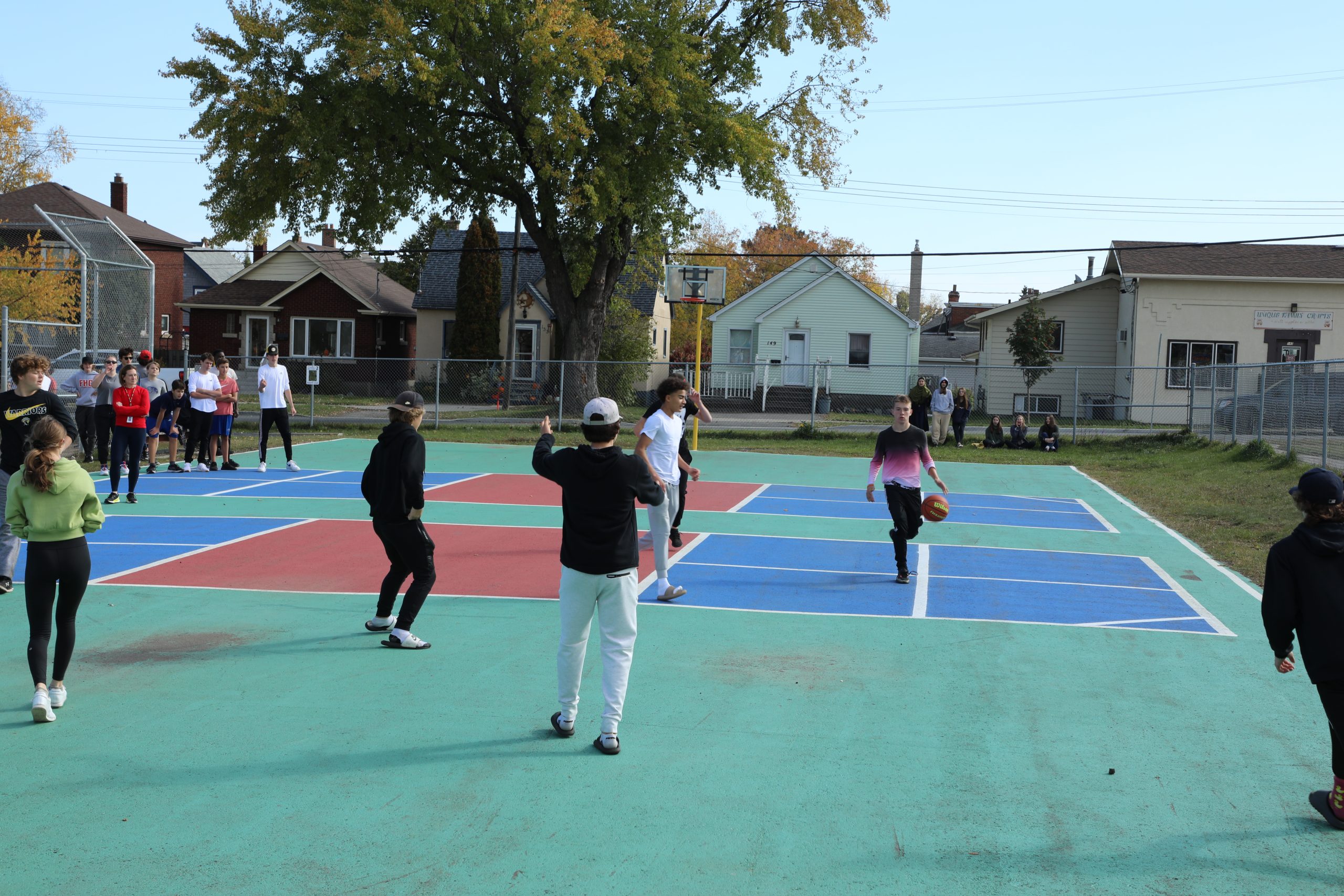 Words of welcome were shared from the schools and school administration teams, the Council and the First Nation. Participants had the opportunity to have a snack, get to know each other and take part in inter-school sports games. Indoors, senior volleyball teams from ÉSC de La Vérendrye and École du secondaire Seventh Fire battled it out in the school gymnasium for a friendly game. Outside, a mixed team of students from the two schools faced off against a mixed adult team in a soccer baseball game, and the students from the 9e à 12e year of La Vérendrye and Seventh Fire played a fun game of basketball.