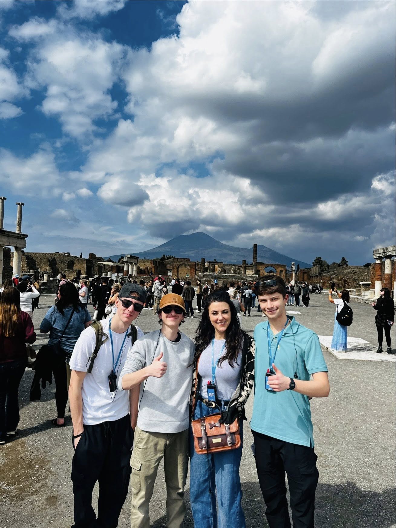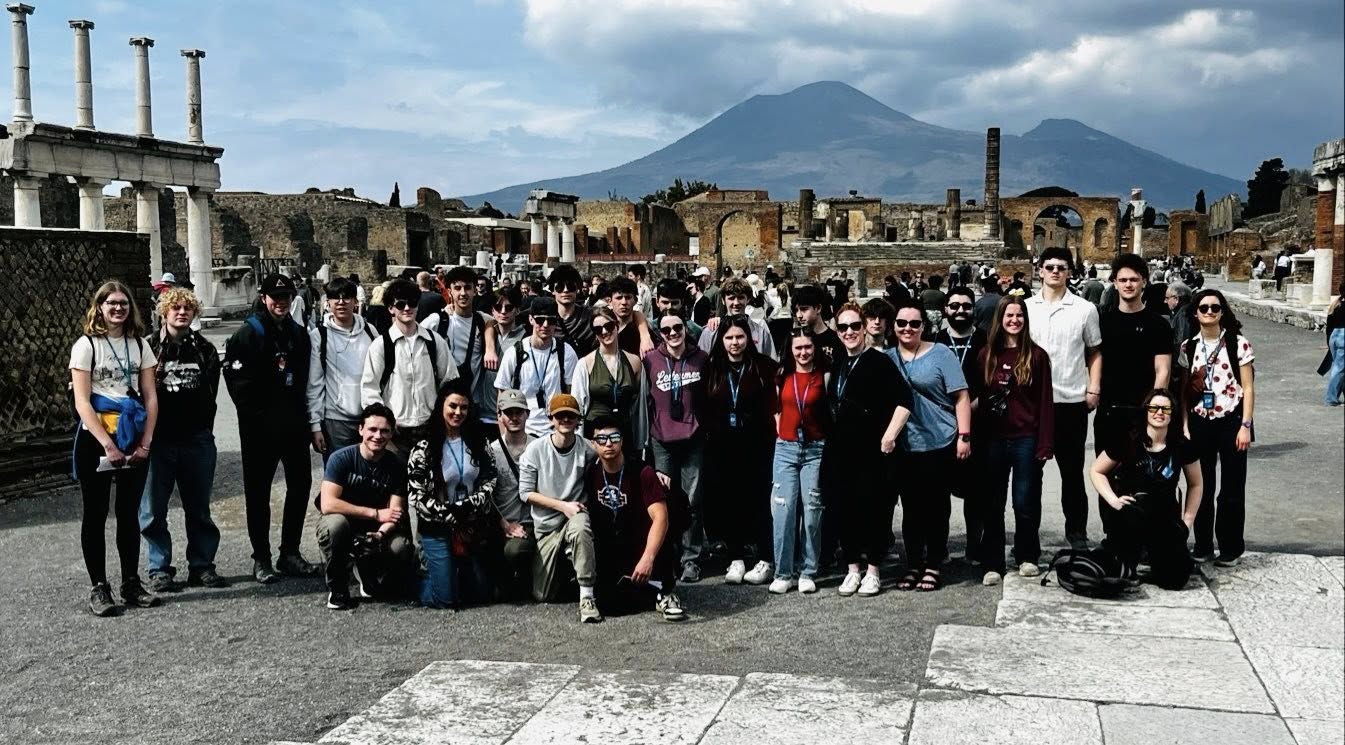 Le lendemain, le groupe a pris la route vers Pompéi pour une visite marquante de cette ville romaine figée dans le temps depuis l’éruption du Vésuve en l’an 79. Exceptionnellement bien conservée, Pompéi offre un aperçu saisissant de la vie quotidienne des Romains il y a près de 2 000 ans : maisons, rues, fresques et moulages des habitants surpris par la catastrophe. Une expérience à la fois éducative et émouvante, qui a profondément marqué les élèves. Le groupe est ensuite retourné à Rome pour une dernière soirée en Italie avant de poursuivre l’aventure.