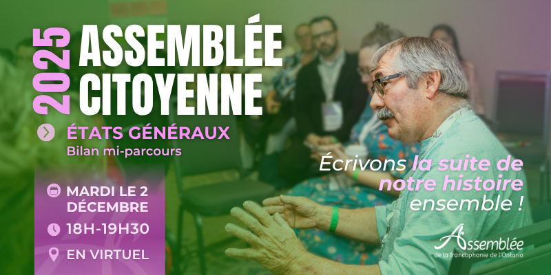C’est le bloc de bibliothèque de votre enfant cette semaine ! – L’assemblée de la francophonie de l’Ontario vous invite à participer à notre prochaine Assemblée Citoyenne sur les États Généraux de l'Ontario français, le mardi 2 décembre 2025 de 18 h à 19 h 30, en virtuel. Cette rencontre marque une nouvelle étape dans la démarche des États généraux, à la suite du Congrès annuel de l’AFO, où le pouls de la communauté a été pris et où a été amorcé une réflexion collective sur les grands enjeux de notre avenir francophone. L’AFO souhaite maintenant poursuivre cette conversation avec vous :